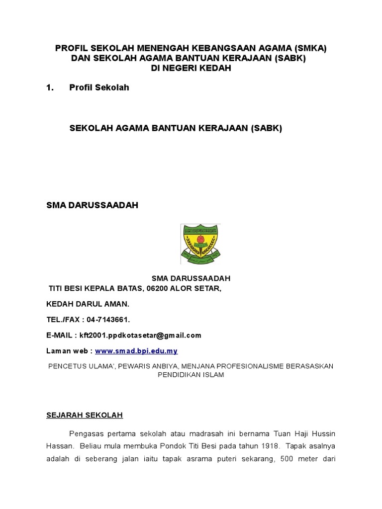 REBUTLAH PELUANG YANG ADA. Sejarah penubuhan Sekolah Menengah Kebangsaan Agama SMKA bermula dengan pengambilalihan 11 buah Sekolah Agama Negeri dan Rakyat oleh Kementerian Pelajaran Malaysia pada tahun 1977. ALOR SETAR - Kerajaan negeri Kedah tidak meminggirkan keperluan sekolah agama rakyat SAR maahad tahfiz dan pondok di negeri ini yang terkesan akibat pandemik Covid-19.